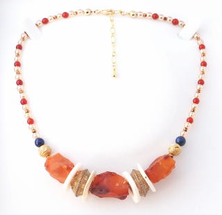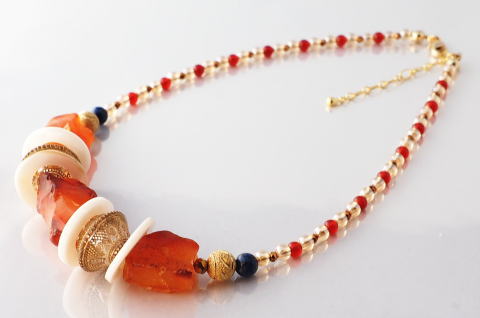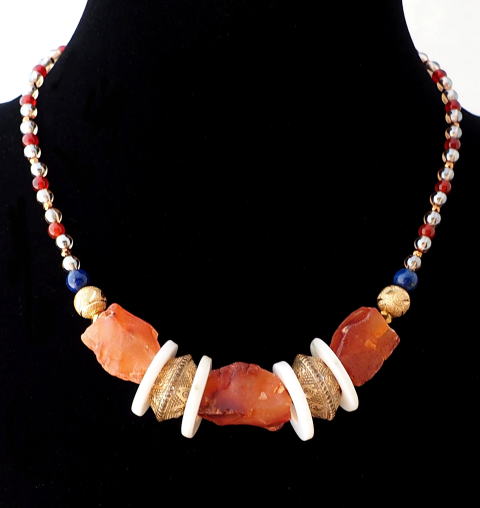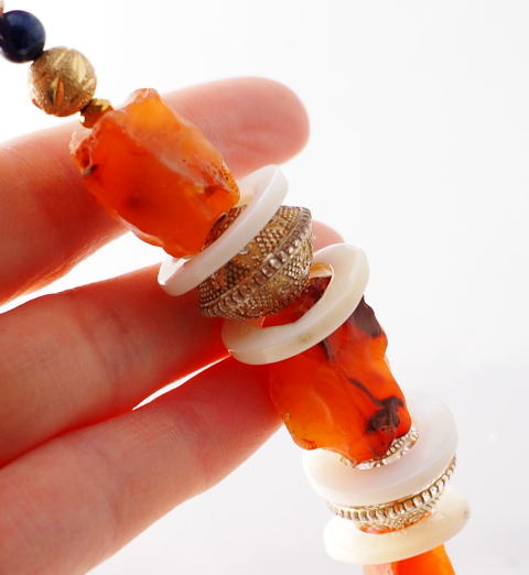 ワイルドなラフカットのカーネリアンは、雌猫のイメージで。ラピスラズリ、金色のオーラクリスタル、ホワイトシェル、マットゴールドのパーツが鮮やかな古代エジプトの雰囲気を醸し出します。