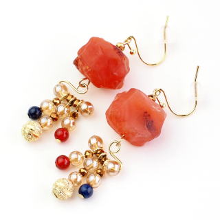 素材:カーネリアン・オーラクリスタル・シェル・アクリルビーズ・ラピスラズリ・金属(真鍮にメッキ)・ガラス・ステンレスワイヤー