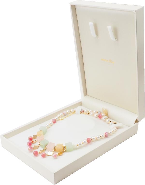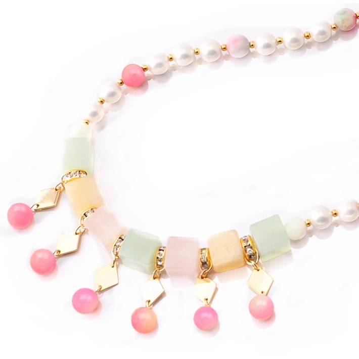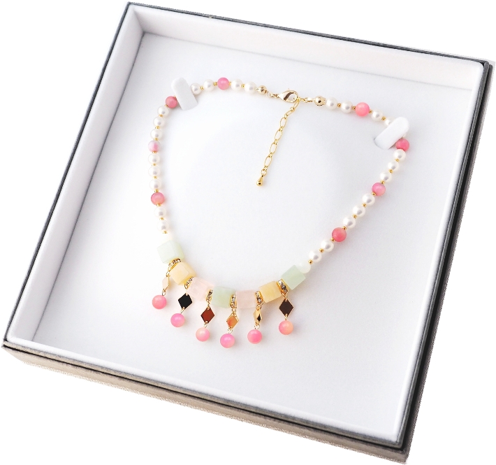 サイズ:長さ約38~44cmアジャスタ使用 (チョーカー~プリンセス)参考:キューブは一辺が約8mm・ミックスカラークォーツァイトやシルキーパールは約6mm玉