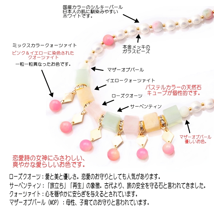 素材:天然石(ミックスカラークォーツァイト・サーペンティン・ローズクオーツ・イエロークォーツァイト・マザーオブパール)・シルキーパール(樹脂)・金属(真鍮+メッキ加工)・本金メッキガラスビーズ・ガラス・テグス 留め具はナスカン+アジャスタ