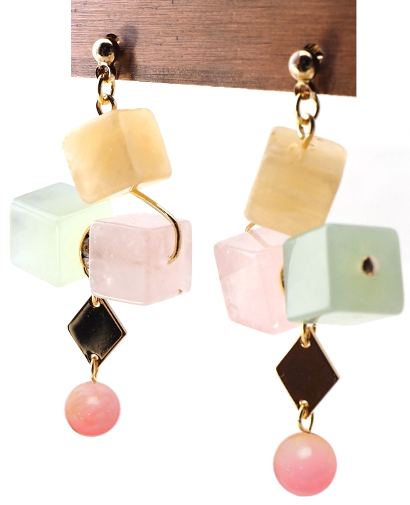 素材:天然石(ローズクオーツ・アラゴナイト・ミックスカラークォーツァイト・金属(真鍮/ピアスポスト部ステンレス+メッキ加工)・ガラス