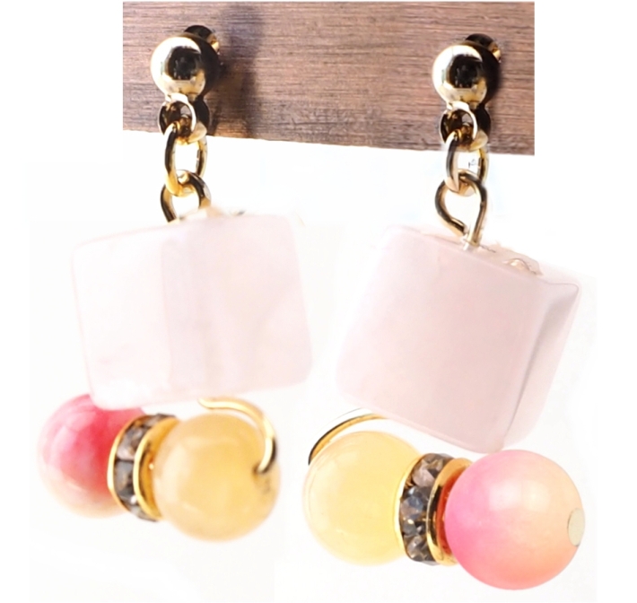 素材:天然石(サーペンティン・ローズクオーツ・イエロークォーツァイト・ミックスカラークォーツァイト・金属(真鍮/ピアスポスト部ステンレス+メッキ加工)・ガラス