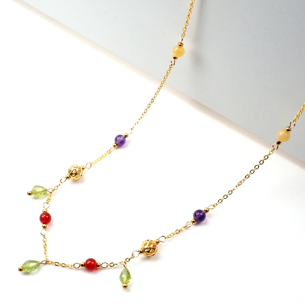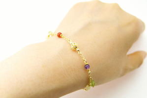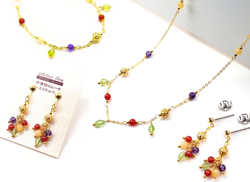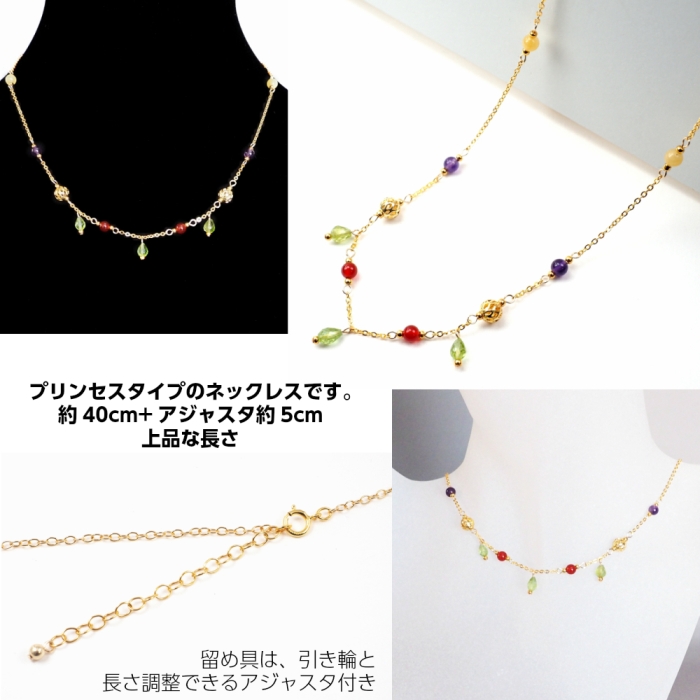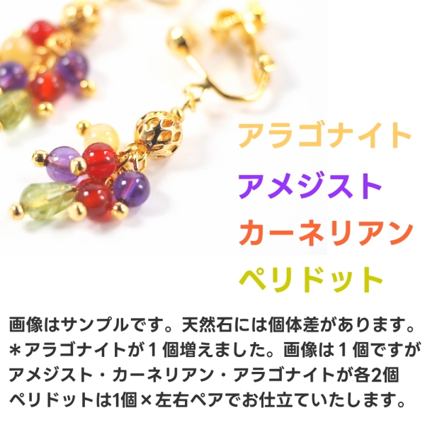 素材:金属(真鍮・チェーン部はゴールドフィルド14KGF)・天然石(ペリドット・カーネリアン・アメジスト・アラゴナイト)・本金メッキガラスビーズ