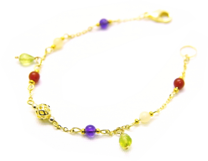 ネガティブなエネルギーから守ってくれるとされる「ペリドット」を中心に、ポジティブなラッキーストーン「カーネリアン」、愛の守護石「アメジスト」、なごみ石・人脈の石「アラゴナイト」を配した、喜びにふさわしい明るいオーラの作品です。