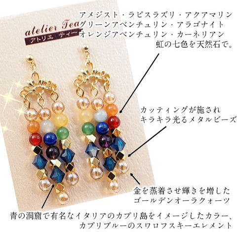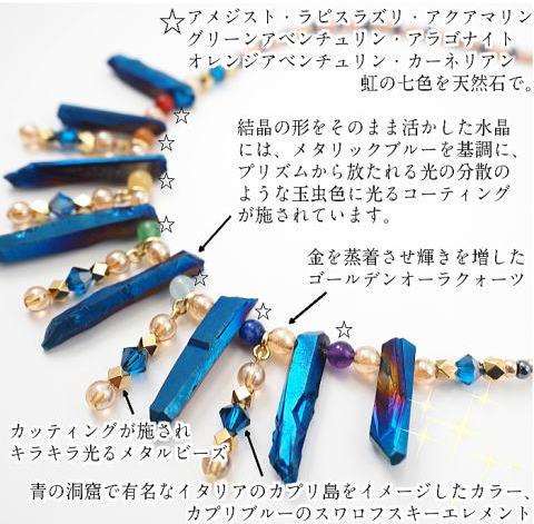 金を蒸着させたゴールデンオーラクォーツと、カッティングされたメタルビーズ、青の洞窟で有名なイタリアのカプリ島をイメージしたカラー「カプリブルー」のスワロフスキーエレメント。イリスの虹を引き立てます。