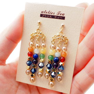 素材:メタリックブルーコーティングクォーツ・シャンパンカラーオーラクォーツ(金を蒸着させた水晶)・天然石(アメジスト・ラピスラズリ・アクアマリン・グリーンアベンチュリン・アラゴナイト・オレンジアベンチュリン・カーネリアン)・スワロフスキーエレメント・ガラスビーズ・金属(真鍮にメッキ加工)・テグス