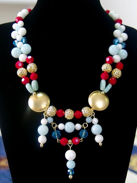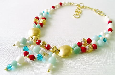 素材:ケシパール(樹脂)・ガラス・天然石(アマゾナイト)・金属(真鍮にメッキ加工)・樹脂・テグス