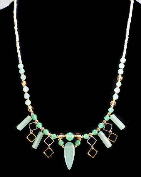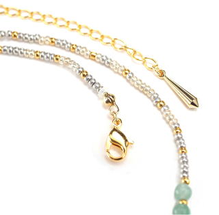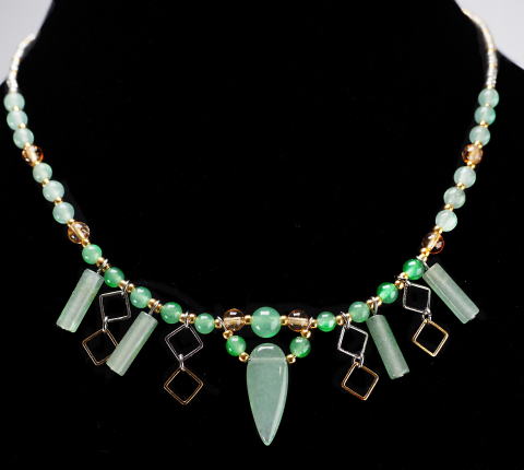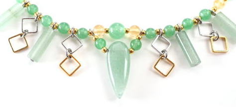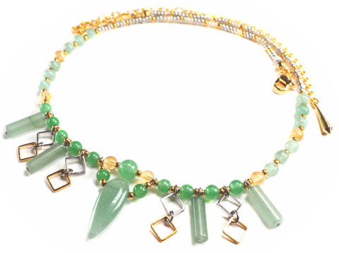 ネックレスでは、円柱と丸玉のグリーンアベンチュリン、透明感のあるシトリン(黄水晶)、本金メッキガラスビーズ、金色銀色のスクエアメタルパーツを配しました。天の川も意識して、メタルパーツ・ガラスビーズは、金色銀色を混ぜて使用しています。