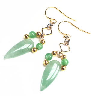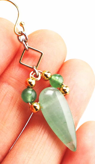 イヤリング・ピアスは、丸玉のグリーンアベンチュリンと、スクエアメタルパーツを、縦のラインが美しく映えるように仕上げています。