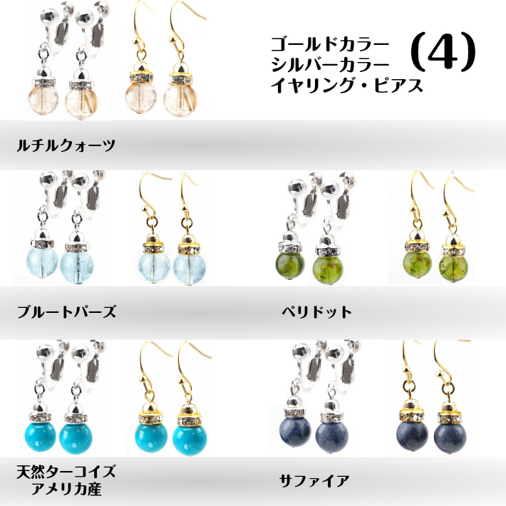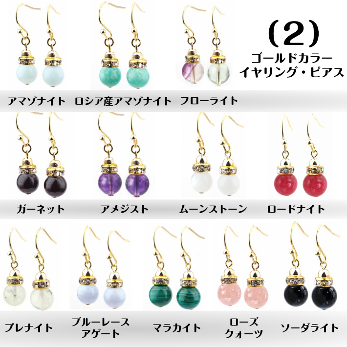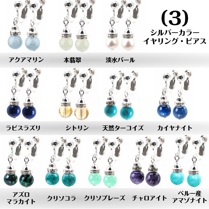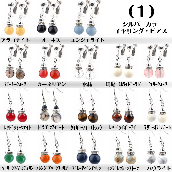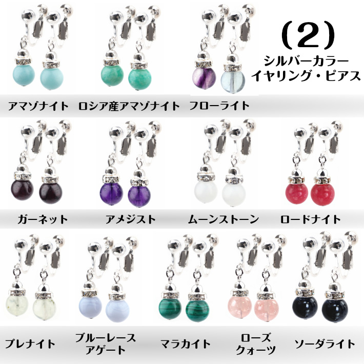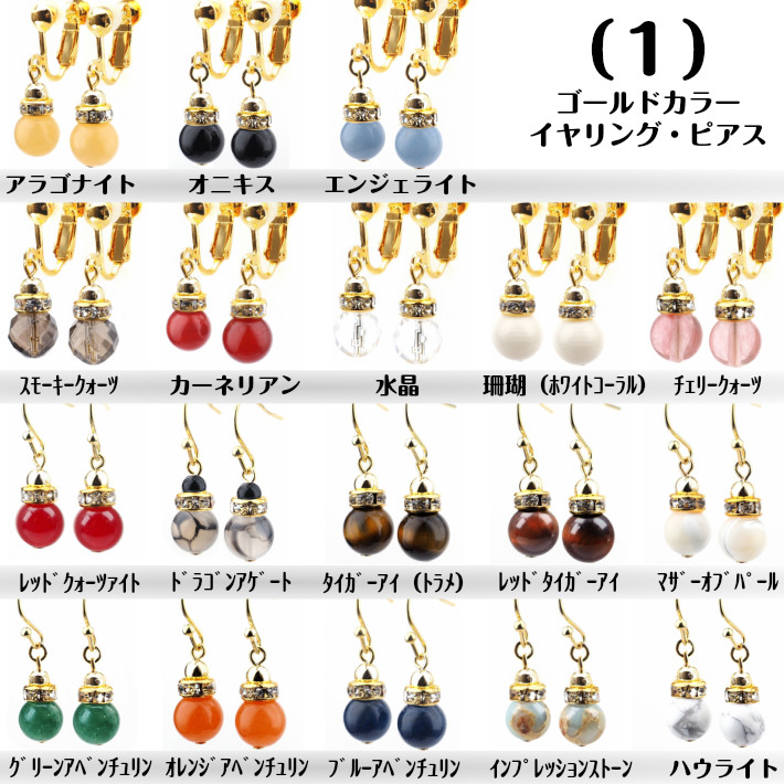 天然石はいづれも約8㎜玉(水晶・スモーキークオーツはラウンドカット。石によって大きさが多少前後します。約7.5~9.5mm)を使用しています。
