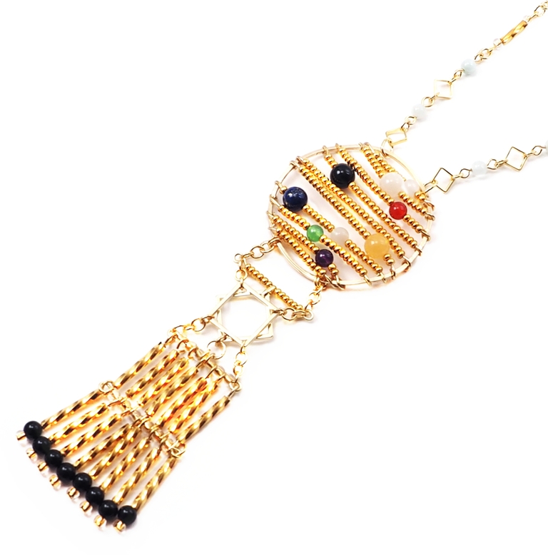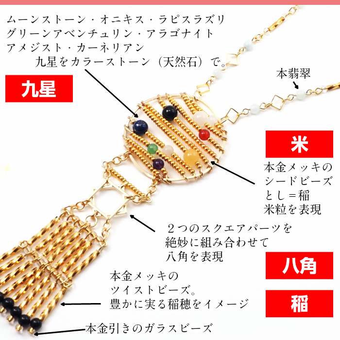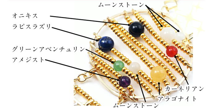素材:金属(真鍮にメッキ加工)・本金メッキガラスビーズ・オニキス(黒瑪瑙)・ジェイド(本翡翠)・ムーンストーン・アラゴナイト・ラピスラズリ・カーネリアン・アメジスト・グリーンアベンチュリン)