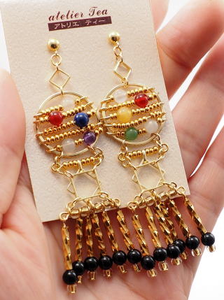 素材:金属(真鍮・ステンレス・ピアスポストとキャッチ部はチタン→ステンレスに変更しました。ニッケルフリー)・本金メッキガラスビーズ・オニキス(黒瑪瑙)・ムーンストーン・カーネリアン・アラゴナイト・ラピスラズリ・アメジスト・グリーンアベンチュリン