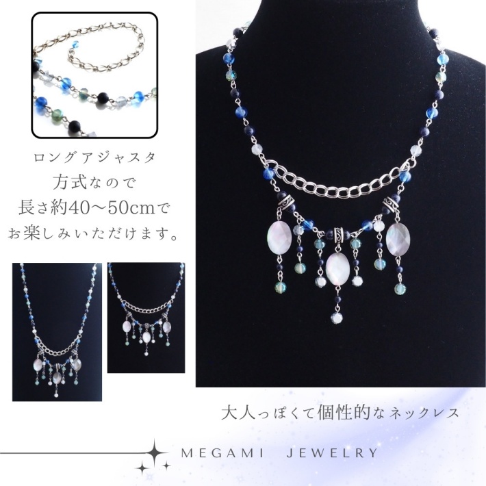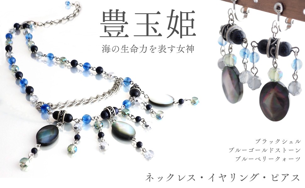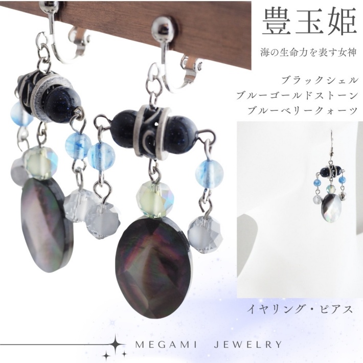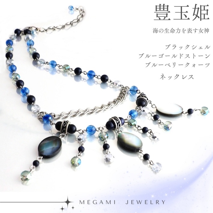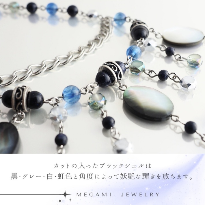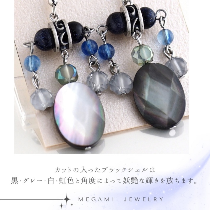 素材:金属(真鍮・ステンレス)・ブラックシェル・ガラス・ブルーゴールドストーン(紫金石・人工石)・ブルーベリークオーツ(人工石)