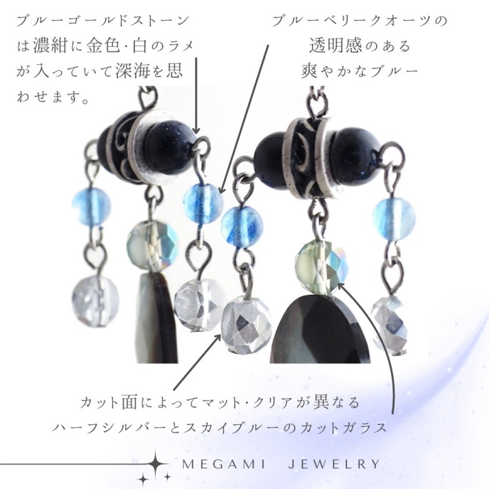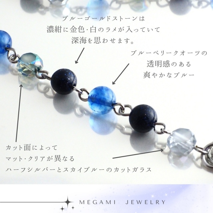 ブルーベリークオーツの、透明感のある爽やかなブルー。ブルーゴールドストーンは、濃紺に金色・白のラメが入っていて、深海を思わせます。