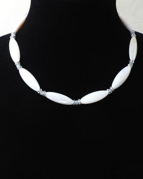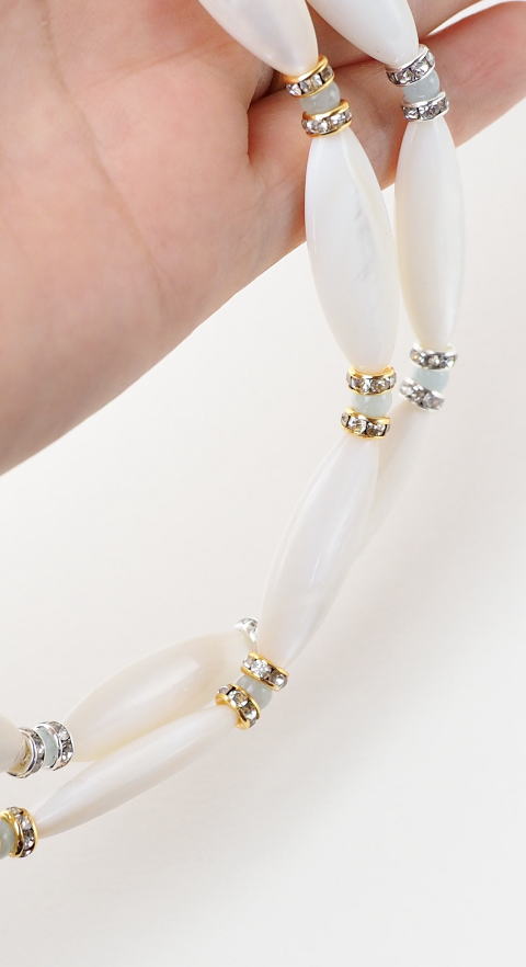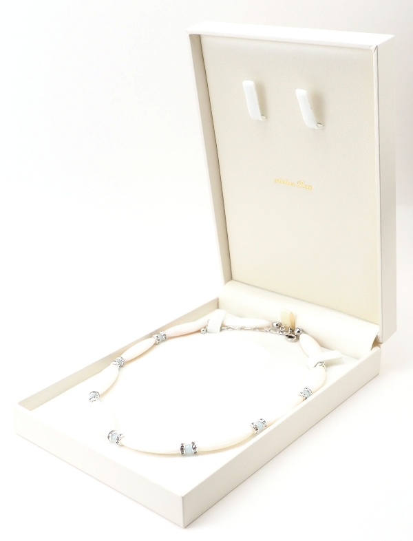 アクアマリンとホワイトシェルの素材感が全面に出ていますので、年齢を問わず着けていただけると思います。
