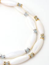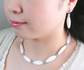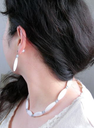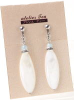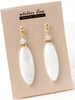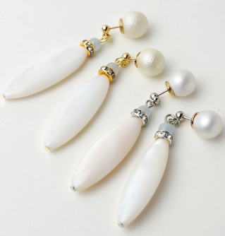 ホワイトシェルは、形と色味に個体差があります。貝独自の茶色い部分が出ているものあります。(茶色が混ざっている個体は後ろ側に、前面はできる限り白い個体を使っております。イヤリング・ピアスには、白い個体を使用しております)