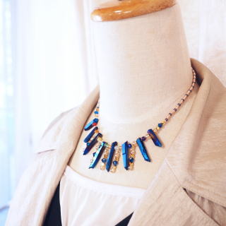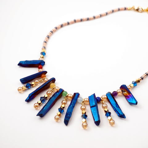 素材:メタリックブルーコーティングクォーツ・シャンパンカラーオーラクォーツ(金を蒸着させた水晶)・天然石(アメジスト・ラピスラズリ・アクアマリン・グリーンアベンチュリン・アラゴナイト・オレンジアベンチュリン・カーネリアン)・スワロフスキーエレメント・ガラスビーズ・金属(真鍮にメッキ加工)・テグス